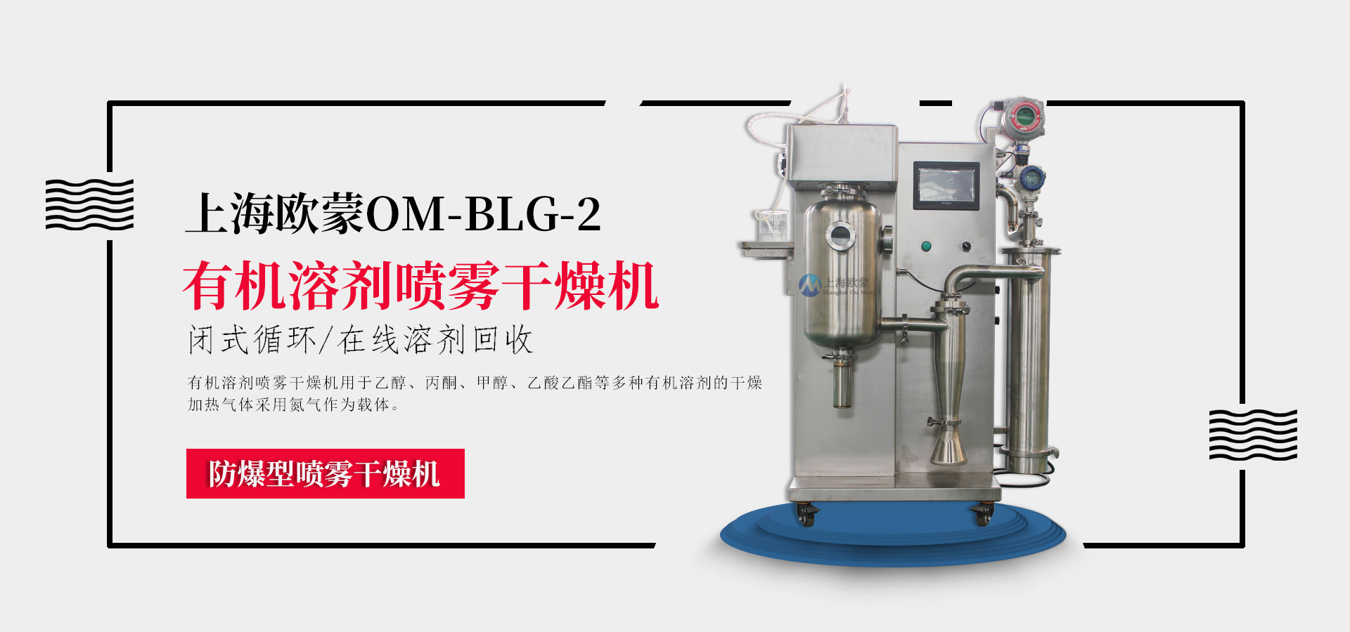 N2氮氣循環(huán)式噴霧干燥機系統(tǒng)采用密閉設(shè)計,主要應(yīng)用于酒精類溶液,N2作為惰性氣體干燥使得設(shè)備運行更加安全。產(chǎn)品無氧化,品質(zhì)好,粉料松裝比重及平均粒徑一致性好,其流動性可滿足自動壓機連續(xù)化生產(chǎn),同時溶劑介質(zhì)可以在線回收。在規(guī)定的條件下溶劑蒸發(fā)能力2Kg/h(根據(jù)物料固體含量)。整套設(shè)備由供料系統(tǒng)、霧化器、電加熱器、干燥塔、旋風收塵器、冷凝塔、防爆裝置、在線氧氣檢測系統(tǒng)及電氣控制系統(tǒng)組成等。